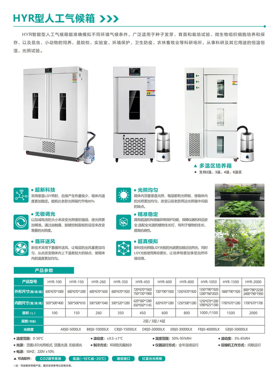 人工气候箱适用于植物的生长和组织培养,种子发芽、育苗微生物的培养试验;昆虫小动物的饲养;水质监测的BOD测定;药材、木材、建材的老化及使用寿命测试等,以及其他用途的光黑,恒温、恒湿的专用试验设备。适用于生命科学、细胞微生物、分子基因遗传等研究;是生物工程、医学、农学、水产、畜牧等众多领域从事科研及生产常用的理想辅助设备,提供了准确的温恒湿及模拟光照的实验条件。
